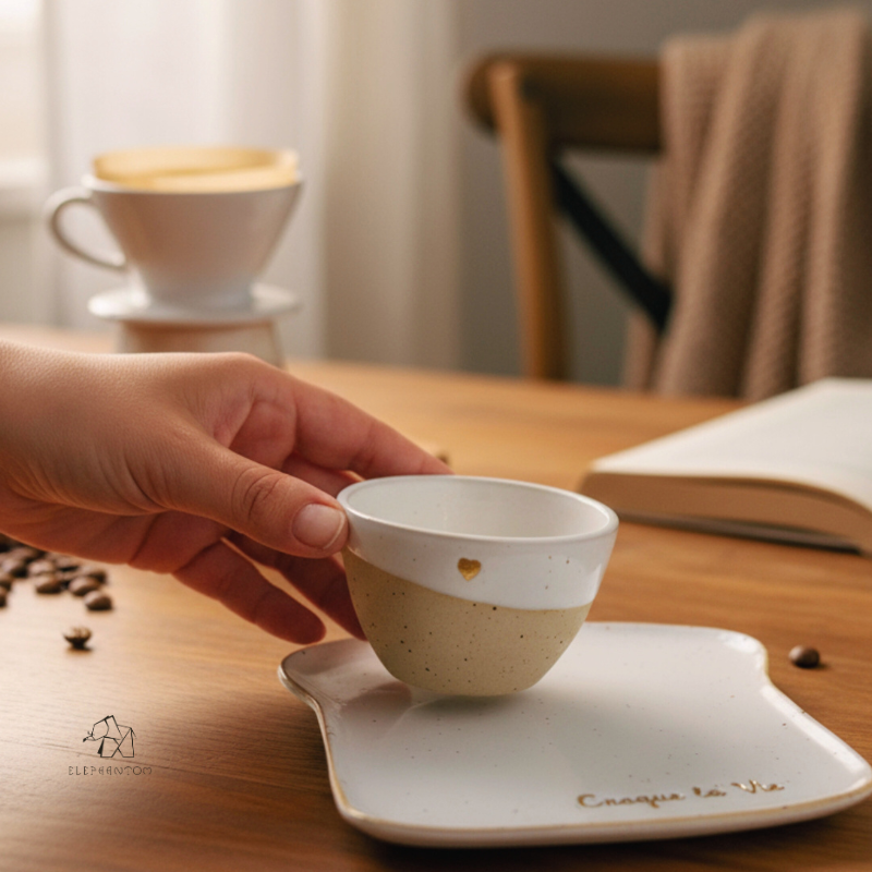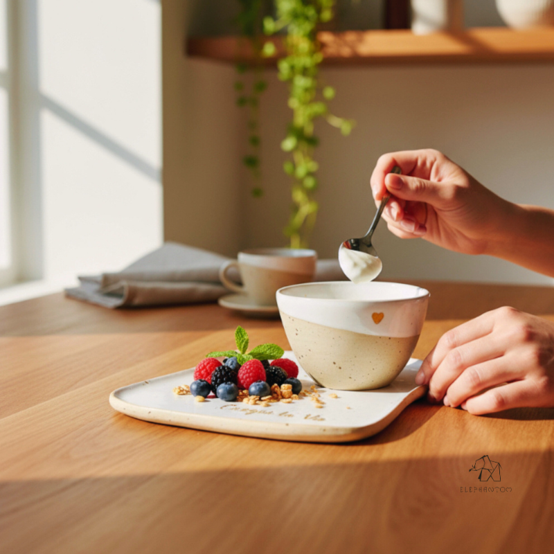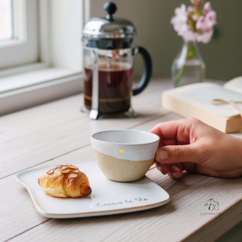 La grande assiette-tartine “Croque la Vie” et le petit bol cœur doré forment un duo doux et joyeux pour les petits-déjeuners, brunchs, pauses goûter ou plateaux réconfortants.