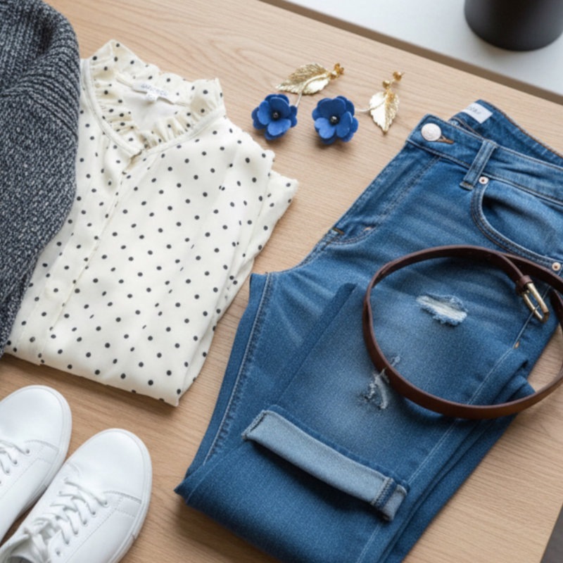 - Avec une chemise blanche et un jean brut : la porcelaine bleue et le doré viennent réhausser une tenue simple, en lui donnant une touche de douceur et d’élégance.