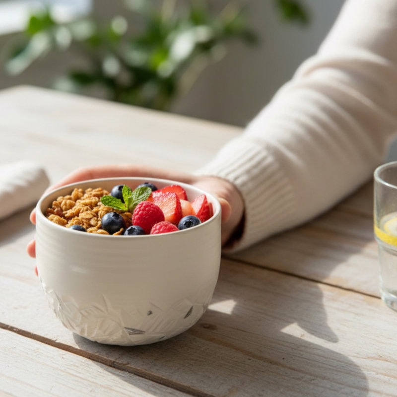 Ce bol de la collection Pyrénées, entièrement façonné à la main dans mon atelier, mêle la douceur d’une porcelaine blanche délicatement texturée à l’éclat discret de touches de platine. Sa forme enveloppante, légère et agréable en main, accompagne vos rituels du quotidien : céréales du matin, matcha, dessert, en-cas réconfortant…